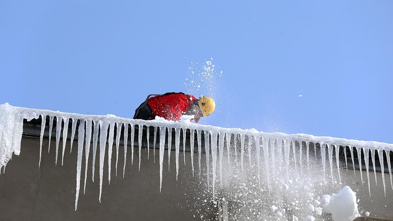 Erzurum'da kış aylarında çatılarda biriken kar kütleleri ve buz sarkıtlarının oluşturduğu tehlikeyi önlemek için profesyonel dağcılar, 'buz timi' kurdu.